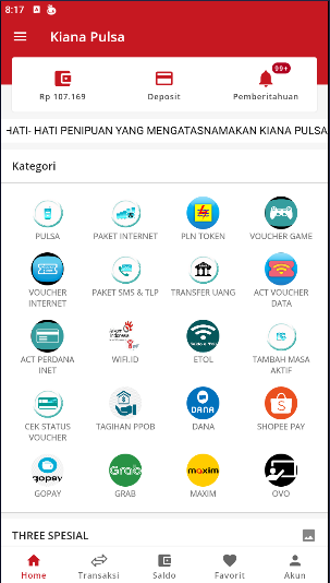 Aplikasi Kiana Pulsa adalah Aplikasi Native Android untuk melakukan transaksi melalui API dari website yang terhubung dengan berbagai suplier dan provider. Beragam produk tersedia seperti pula, kuota, bayar listrik, pdam, juga untuk ewallet dan lainnya yang termasuk dalam produk digital.